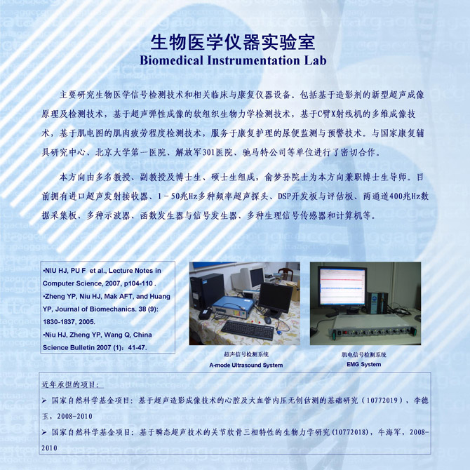 生物医学信息、测量技术与仪器实验室是一个集中常用电子测量仪器、A型B型超声仪器、计算机单片机与DSP、以及多种人体医学检测仪器等设备的综合实验室。在人体软硬组织超声测量与建模、脑组织磁共振成像与处理、人体生理电信号与声信号测量、人体生理过程建模与应用等方向开展研究工作,并取得了一定的研究成果。