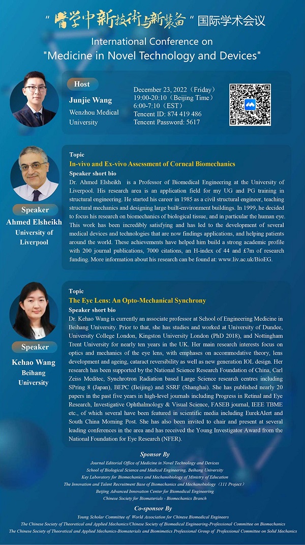 专家简介:Dr. Kehao Wang is currently an associate professor at School of Engineering Medicine in Beihang University. Prior to that, she has studies and worked at University of Dundee, University College London, Kingston University London (PhD 2018), and Nottingham Trent University for nearly ten years in the UK. Her main research interests focus on optics and mechanics of the eye lens, with emphases on accommodative theory, lens development and ageing, cataract reversibility as well as new generation IOL design. Her research has been supported by the National Science Research Foundation of China, Carl Zeiss Meditec, Synchrotron Radiation based Large Science research centres including SPring 8 (Japan), BEPC (Beijing) and SSRF (Shanghai). She has published nearly 20 papers in the past five years in high-level journals including Progress in Retinal and Eye Research, Investigative Ophthalmology & Visual Science, FASEB journal, IEEE TBME etc., of which several have been featured in scientific media including EurekAlert and South China Morning Post. She has also been invited to chair and present at several leading conferences in the area and has received the Young Investigator Award from the National Foundation for Eye Research (NFER).