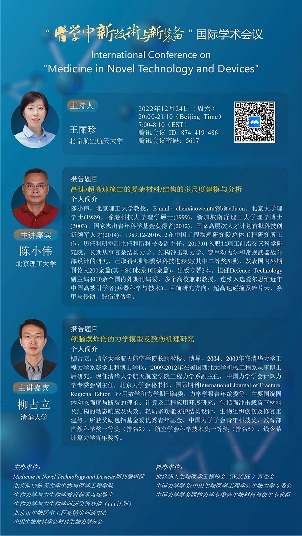 本次会议由Medicine in Novel Technology and Devices期刊编辑部、北京欧美大片ppt免费大全生物与医学工程学院、生物力学与力生物学教育部重点实验室、生物力学与力生物学创新引智基地(111计划)、北京市生物医学工程高精尖创新中心、中国生物材料学会材料生物力学分会主办,由世界华人生物医学工程协会(WACBE)青委会、中国力学学会/中国生物医学工程学会生物力学专委会、中国力学学会固体力学专委会生物材料与仿生专业组协办,医学中新技术与新装备国际学术会议将于2022年11月-12月以线上方式举办。
