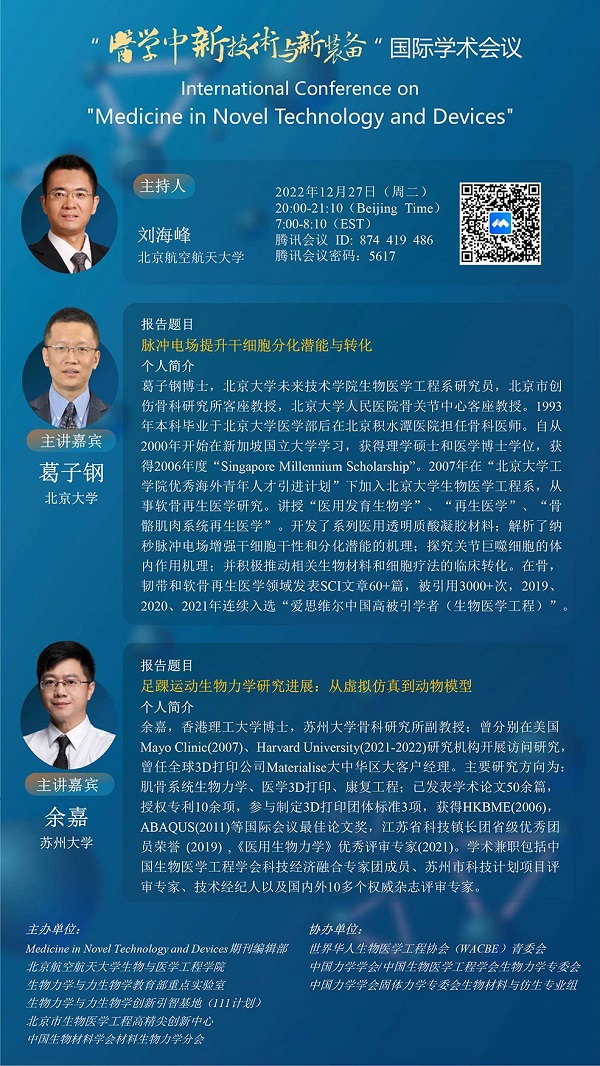 本次会议由Medicine in Novel Technology and Devices期刊编辑部、北京欧美大片ppt免费大全生物与医学工程学院、生物力学与力生物学教育部重点实验室、生物力学与力生物学创新引智基地(111计划)、北京市生物医学工程高精尖创新中心、中国生物材料学会材料生物力学分会主办,由世界华人生物医学工程协会(WACBE)青委会、中国力学学会/中国生物医学工程学会生物力学专委会、中国力学学会固体力学专委会生物材料与仿生专业组协办,医学中新技术与新装备国际学术会议将于2022年11月-12月以线上方式举办。