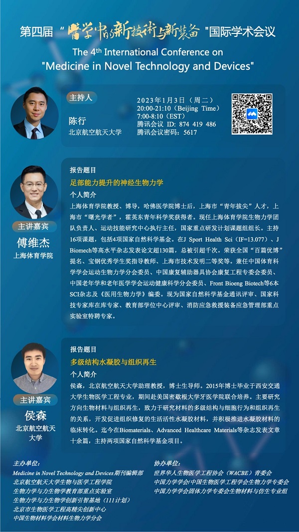 本次会议由Medicine in Novel Technology and Devices期刊编辑部、北京欧美大片ppt免费大全生物与医学工程学院、生物力学与力生物学教育部重点实验室、生物力学与力生物学创新引智基地(111计划)、北京市生物医学工程高精尖创新中心、中国生物材料学会材料生物力学分会主办,由世界华人生物医学工程协会(WACBE)青委会、中国力学学会/中国生物医学工程学会生物力学专委会、中国力学学会固体力学专委会生物材料与仿生专业组协办,医学中新技术与新装备国际学术会议将于2023年1月以线上方式举办。