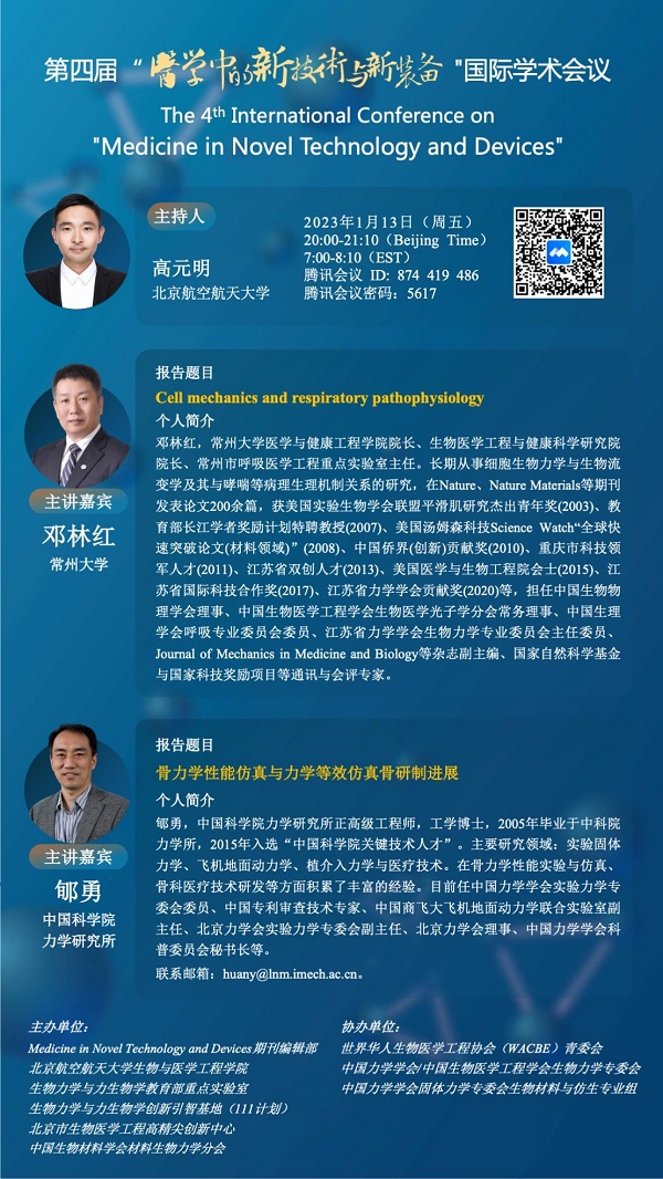 本次会议由Medicine in Novel Technology and Devices期刊编辑部、北京欧美大片ppt免费大全生物与医学工程学院、生物力学与力生物学教育部重点实验室、生物力学与力生物学创新引智基地(111计划)、北京市生物医学工程高精尖创新中心、中国生物材料学会材料生物力学分会主办,由世界华人生物医学工程协会(WACBE)青委会、中国力学学会/中国生物医学工程学会生物力学专委会、中国力学学会固体力学专委会生物材料与仿生专业组协办,医学中新技术与新装备国际学术会议将于2023年1月以线上方式举办。