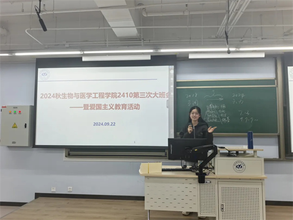 时维九月,喜看秋意正浓。在祖国母亲75周岁生日即将来临之际,生物与医学工程学院2410大班召开了第三次大班会暨爱国主义教育活动。学院本科生第二党支部书记、2021级本科生辅导员邢一冰以及2410大班全体成员参加,2024级本科生辅导员王雪竹主持。